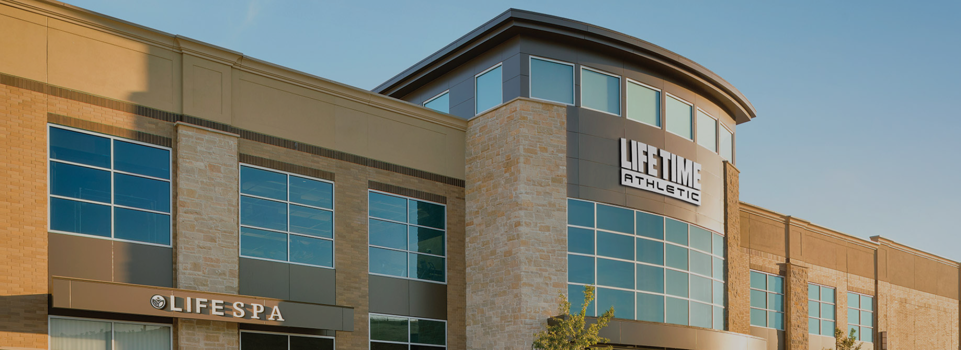 Front entrance to Life Time club with clear blue skies.